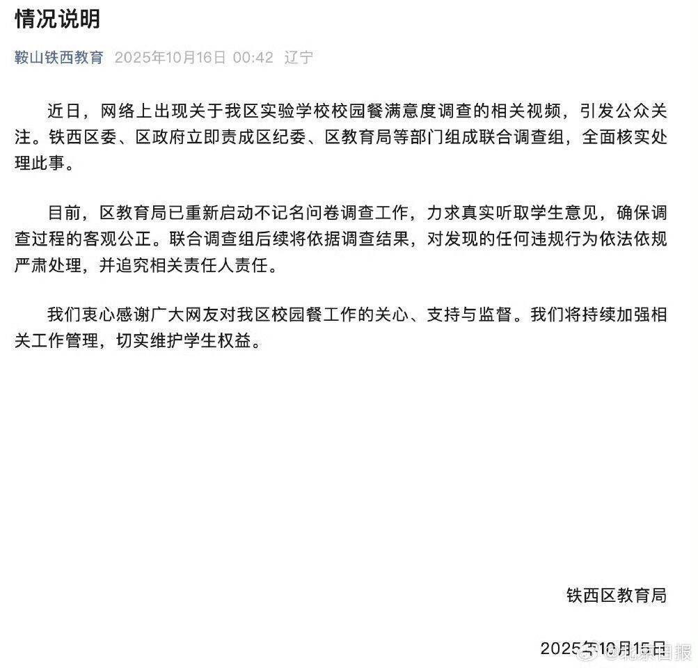 近日,网络上出现关于我区实验学校校园餐满意度调查的相关视频,引发公众关注。铁西区委、区政府立即责成区纪委、区教育局等部门组成联合调查组,全面核实处理此事。